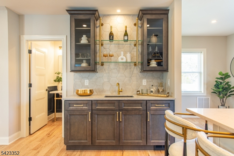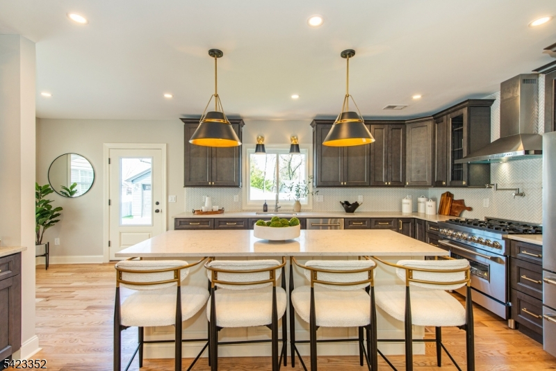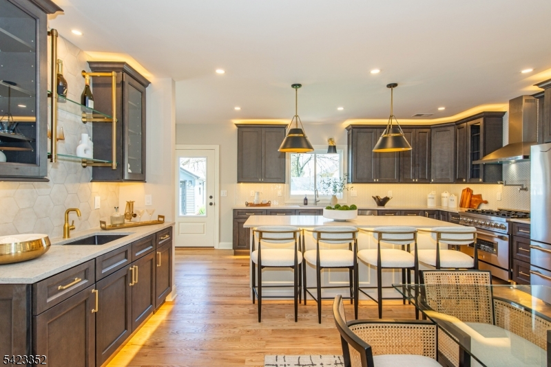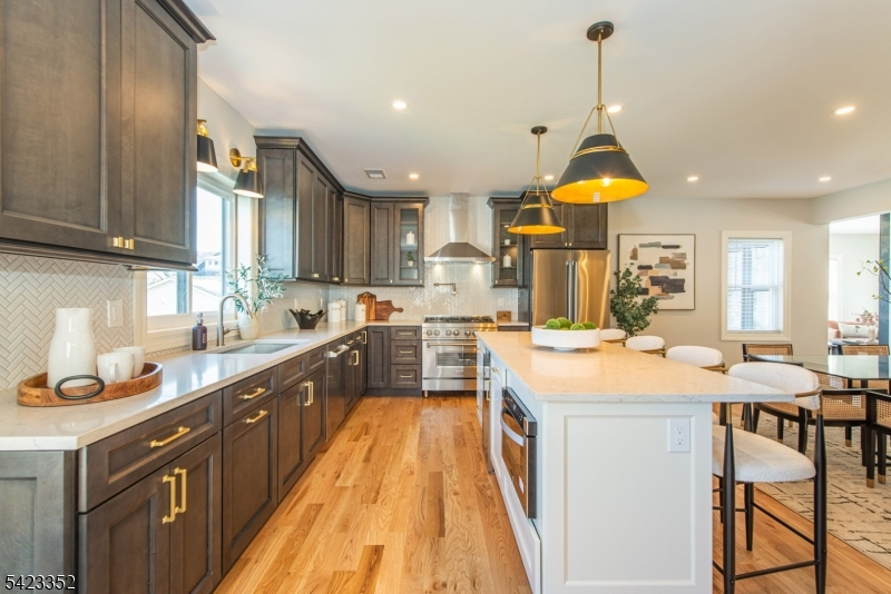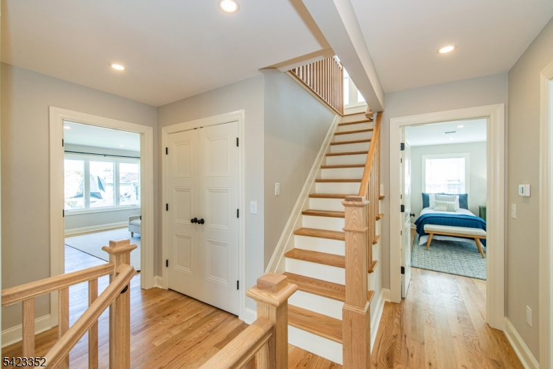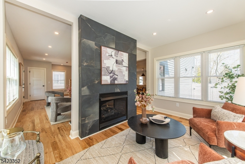 This newly Renovated Contemporary Colonial is set along one of Bloomfield's beautiful tree lined streets, where classic refinement meets modern luxury. A dramatic front entrance with a striking glass door, curated lighting, and expansive windows creates a warm welcome at dusk. The home offers four bedrooms, four full baths, and a first floor powder room. The spacious living room with a two sided fireplace opens to an additional sitting room, while oak hardwood flooring flows throughout. The bespoke kitchen and wet bar feature custom cabinetry, Calacatta quartz countertops, Klien appliances, and a walk in pantry. The primary suite is a sanctuary with a spa inspired bath, a walk in shower for two, rich finishes, a custom closet, and oversized windows framing mesmerizing views. Additional bedrooms are generously sized, filled with natural light, and include custom closets. A serene third floor suite provides an extra bedroom, den, and full bath with treetop vistas. The inviting family room offers custom built ins, a full bath, and a dedicated laundry room. From the kitchen, step onto your private deck and custom patio overlooking an expansive yard with newly planted landscaping and full property irrigation. The home includes efficient two zone heating and cooling for year round comfort. A modern tankless water heater provides endless hot water and energy efficiency. Privacy fencing completes the outdoor space, all moments from NYC transit, great amenities, and beautiful parks.